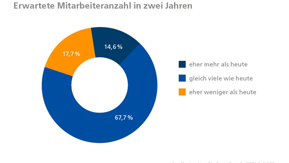 Was die Personalplanung angeht, schätzen 14,6 Prozent der Befragten, innerhalb von zwei Jahren mehr Mitarbeiterinnen und Mitarbeiter zu haben. 67,7 Prozent gehen davon aus, gleich viele Beschäftigte zu haben und 17,7 Prozent befürchten, Stellen abbauen zu müssen. Im Sommer zuvor spiegelten die Werte mit 15,9 Prozent (mehr Mitarbeitende), 70,3 Prozent (gleich viel) und 13,8 Prozent (weniger Mitarbeitende) noch mehr Zuversicht wider.