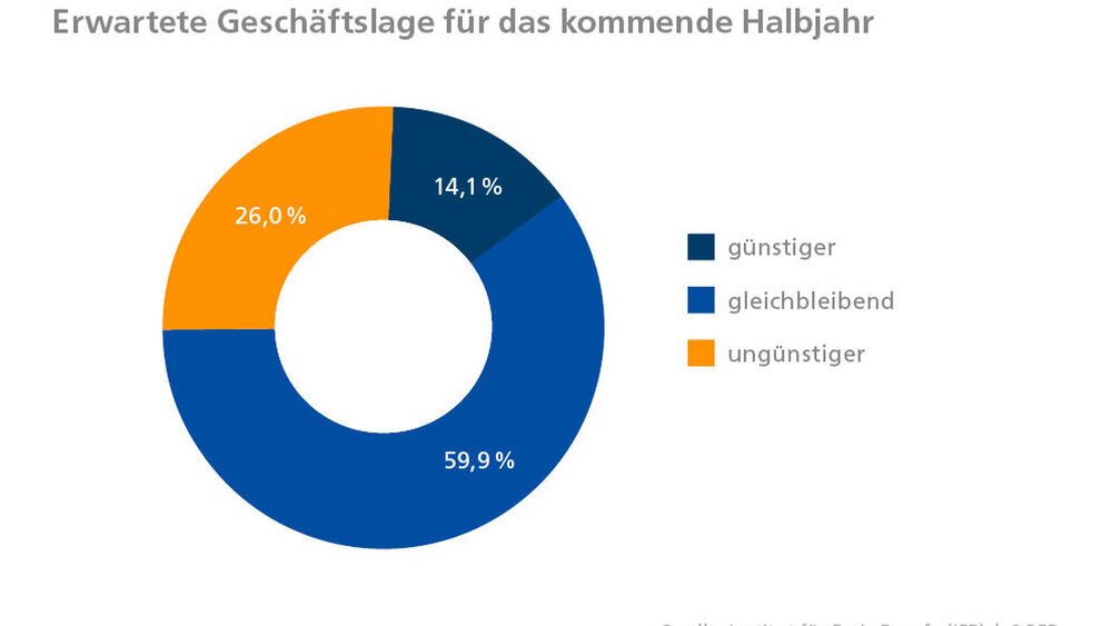 Für das kommende Halbjahr erwarten 14,1 Prozent der Befragten eine günstigere, 59,9 Prozent eine gleichbleibende und 26 Prozent eine ungünstigere Entwicklung. Hier haben sich die Werte im Vergleich zum letztjährigen Sommer leicht gebessert: Diese lagen bei 12,8 Prozent (günstiger), 60,6 Prozent (gleichbleibend) und 26,6 Prozent (ungünstiger).