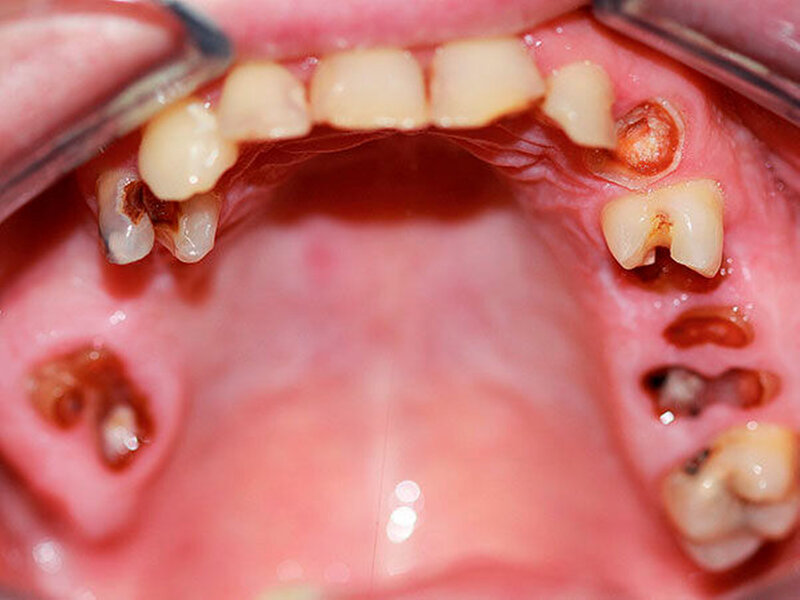 Bei chronischem Crystal-Meth(CM)-Konsum wurde eine Vielzahl körperlicher und psychischer Langzeitwirkungen, beispielsweise Herz-Kreislauf-Erkrankungen, strukturelle Hirnschädigungen und Persönlichkeitsveränderungen, beobachtet [Hamamoto et al., 2009]. In der aktuellen Literatur werden außerdem schwerwiegende Auswirkungen auf die Zahn-, Mund- und Kieferregion beschrieben [Hamamoto et al., 2009; Rhodus et al., 2008]. In den USA, wo nach Schätzungen knapp ein Drittel der weltweit über 30 Millionen CM-Abhängigen lebt, wurde 2005 erstmals der Begriff des „Meth mouth“ in der Fachliteratur genannt [Hamamoto et al., 2009; Rhodus et al., 2005] (Abbildung 1). Dabei wurden fünf Kardinalsymptome beschrieben: 1. Grassierende Karies (Abbildungen 2 und 3), 2. Gingivitis und Parodontitis, 3. Xerostomie, 4. Bruximus und 5. Trismus [Hamamoto et al., 2009; Rhodus et al., 2008].