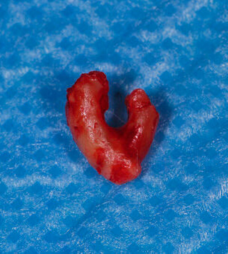 In der 3-D-Aufnahme bestätigte sich der Verdacht, dass der Nerv zwischen den Wurzeln hindurch zog, wobei beim Zahn 48 die Wurzeln den Nerv komplett umklammerten (Abbildungen 3 und 4). Nach Inzision auf dem aufsteigenden Unterkieferast mit Entlastung an den Zähnen 37 beziehungsweise 47 wurden der Knochen und im Weiteren die Weisheitszähne dargestellt. Die Kronen wurden von der Wurzel getrennt, die Wurzeln separiert und sukzessive entfernt, wobei die Integrität der Nerven auf beiden Seiten erhalten blieb (Abbildung 5).