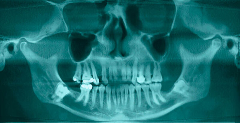 In der aus der digitalen Volumentomografie herausgerechneten Panoramaschichtaufnahme analogen Darstellung kann man schön die Alteration des Nervverlaufs in unmittelbarer Nachbarschaft zu den Weisheitszähnen erkennen. Der Nerv taucht von proximal kommend noch hinter dem Zahn liegend in die Tiefe, um dann auf Höhe der distalen Wurzel wieder in einem geraden Verlauf nach vorne weiter zu ziehen.