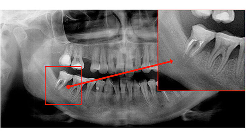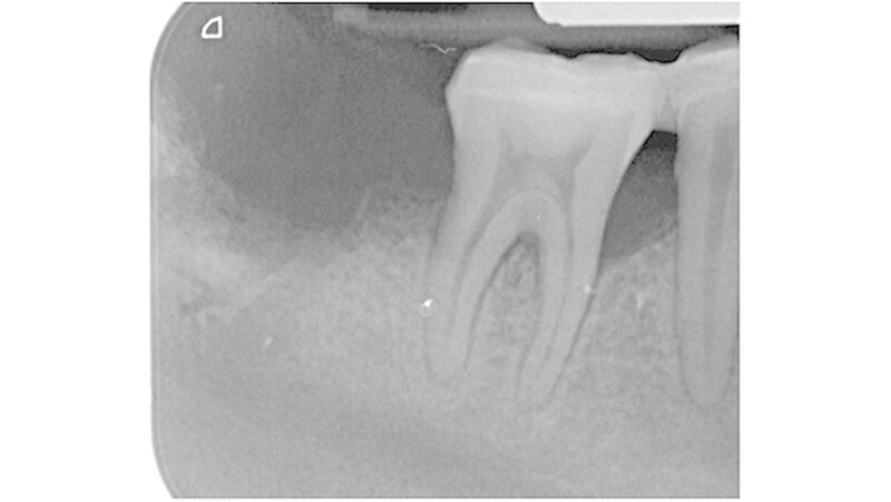 Der Zahn 47 stellte sich parodontal geschädigt und 1-gradig gelockert dar. Das Orthopantomogramm (OPTG) und der anschließend angefertigte Zahnfilm (Abbildungen 2 und 3) zeigten am Zahn 47 apikal weit überextrudiertes Wurzelfüllmaterial. Die Patientin wurde aufgrund der klinischen und der röntgenologischen Befunde sofort an die Klinik und Poliklinik für Mund-, Kiefer- und Gesichtschirurgie überwiesen.