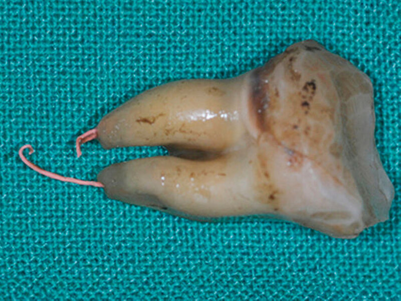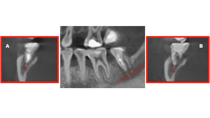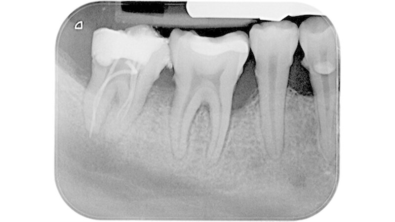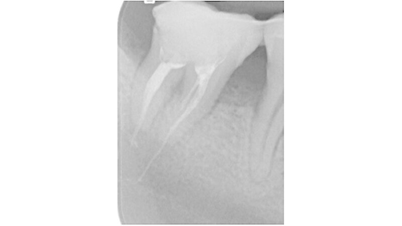 Eine 34-jährige Patientin stellte sich zur Wurzelkanalbehandlung des Zahns 47 und zur Behandlung ihrer generalisierten schweren chronischen Parodontitis in der Poliklinik für Zahnerhaltung und Parodontologie der Universitätsmedizin Rostock vor. Nach Trepanation und manueller Aufbereitung des infizierten Wurzelkanals im Studentenkurs wurde eine Röntgen-Messaufnahme mit einem Guttaperchapoint in der Größe des zuletzt verwendeten Instruments angefertigt.