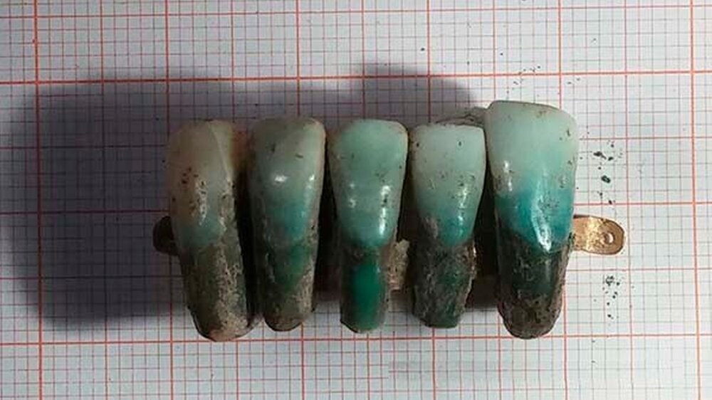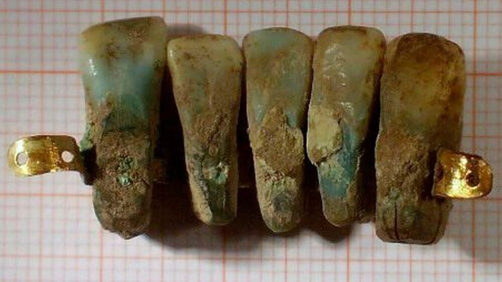 Die gefundene Prothese besteht aus drei mittleren Schneidezähnen und zwei seitlichen Eckzähnen, die von verschiedenen Menschen stammen. Die Wurzelspitze jedes Zahns wurde entfernt, so dass die Brücke in den Kiefer gesetzt werden konnte. Um die Zähne zu fixieren, wurde ein goldenes Band angebracht. Zwei kleine goldene Stifte sorgten für Halt an jedem Zahn.