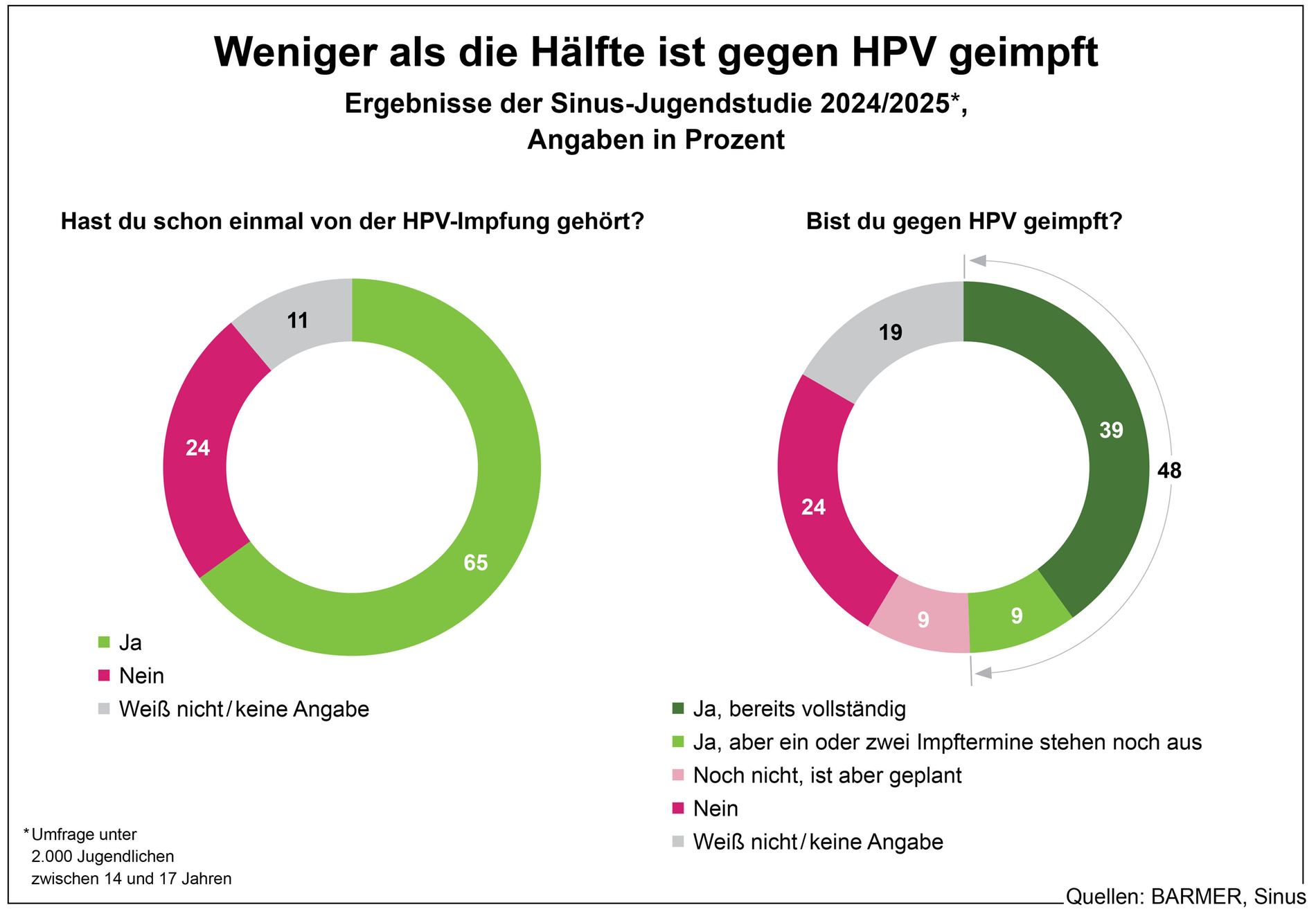 Nicht einmal jeder zweite Jugendliche zwischen 14 und 17 Jahren ist gegen das humane Papillomavirus (HPV) geimpft, das der Hauptverursacher von Gebärmutterhalskrebs ist. Das geht aus der repräsentativen Sinus-Jugendstudie 2024/2025 im Auftrag der BARMER hervor, für die im Herbst 2024 bundesweit 2.000 Jugendliche befragt wurden. Demnach waren nur 48 Prozent zumindest einmal gegen HPV geimpft. Bei weiteren neun Prozent war die Immunisierung geplant. 55 Prozent der weiblichen und 42 Prozent der männlichen Teenager waren zumindest einmal geimpft.