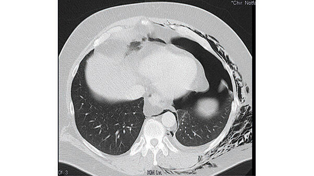 Die daraufhin durch die visceralchirurgische Abteilung durchgeführte Röntgen-Thorax-Aufnahme ergab keinen Frakturbefund im Bereich der Rippen bei ausgedehntem Weichteilemphysem. Bei weiterhin unklarer Diagnose und fehlenden radiologischen Korrelationen wurde auf nachdrückliche Indikation des MKG-Chirurgen eine Computertomografie des Thorax durchgeführt.