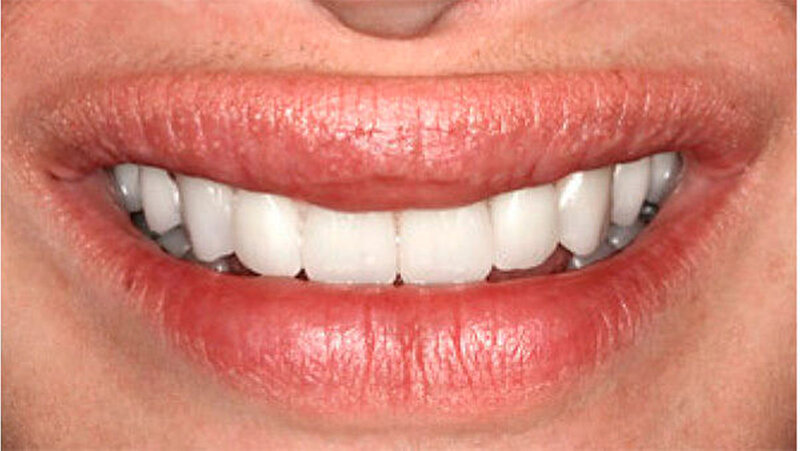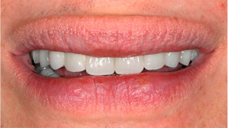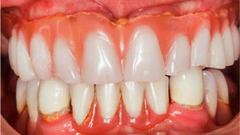 Die Patientin war mit einer knapp neunjährigen Teilprothese im Ober- und einer zweijährigen Totalprothese im Unterkiefer versorgt. Beim Lachen wurden die nicht mehr altersentsprechenden Prothesenzähne mit den deutlichen Randverfärbungen ersichtlich (Abb. 19). Das sagittale Wachstum des zahnlosen Unterkiefers führte in den letzten zwei Jahren aufgrund der verstärkten Kontakte im Frontzahnbereich zu einer beidseitigen Nonokklusion im Seitenzahnbereich (Abb. 20). Eine rasche Verbesserung der Ästhetik als auch der Funktion war unbedingt angezeigt, um das Selbstbewusstsein dieses puberalen Mädchens zu stärken.