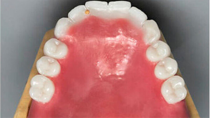 Um die Realisierbarkeit des Therapieziels zu überprüfen, erfolgte im Vorfeld eine diagnostische Aufstellung der Prothesenzähne im Ober- und im Unterkiefer, was eine adäquate Analyse des intra- und intermaxillären Platzangebots ermöglichte (Abb. 8 bis 10). Nun wurden die Pfeilerzähne für die Rekonstruktion mit Teleskopkronen präpariert (Abb. 11). Die individuellen Abformlöffel für die definitive Abformung entsprachen einem Duplikat der diagnostischen Aufstellungen des Ober- und Unterkiefers aus durchsichtigem Kunststoff. Dies ermöglichte gleichzeitig die Montage der Meistermodelle und die Übertragung der Gesamtaufstellung auf das Meistermodell.