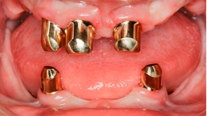 Nach Einprobe der Aufstellung der Prothesenzähne in Wachs wurden die Primärteile aus Gold und deren Galvano-Sekundärteile hergestellt. Letztere wurden in die fertige Prothese eingeklebt (Abb. 12 und 13). Auf eine gegossene Gerüstverstärkung wurde aufgrund des ausreichenden Platzangebots und der relativ geringen Kaufkräfte bei dieser, als Übergangsprothese geplanten Arbeit, aus Kostengründen verzichtet. Zur Erhöhung der Bruchzähigkeit erfolgte die Prothesenherstellung mit dem IvoBase® System (IvoBase® Injector, IvoBase® High Impact). Eine zusätzliche Glasfaserverstärkung zur Frakturprophylaxe wurde in den Prothesenkunststoff eingearbeitet.
