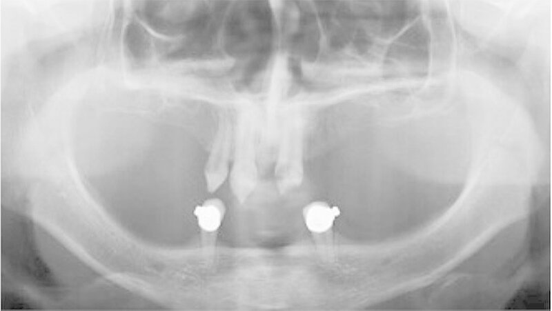 Der bei Behandlungsbeginn 14-jährige Patient war mit einer neun beziehungsweise fünfjährigen Prothese im Unter- beziehungsweise Oberkiefer versorgt (Abb. 2 und 3). Die angelegten Zapfenzähne 12, 11 und 21 waren bereits mehrfach konservierend restauriert und wiesen diverse Stellen mit Sekundärkaries auf. Die Kronenränder der Zähne 33 und 43 waren deutlich sondierbar. Der Kieferkamm im Unterkiefer war aufgrund der fehlenden Zahnanlagen sehr schmal (Abb. 4 bis 6). Die Panoramaschichtaufnahme zeigte das reduzierte vertikale Knochenangebot (Abb. 7). Da die Vitalerhaltung der wenigen Restzähne aufgrund des jungen Alters des Patienten unbedingt anzustreben war, wurde als Behandlungsziel im Ober- und Unterkiefer eine Versorgung mit Hybridprothesen, retiniert auf Teleskopkronen, festgelegt.