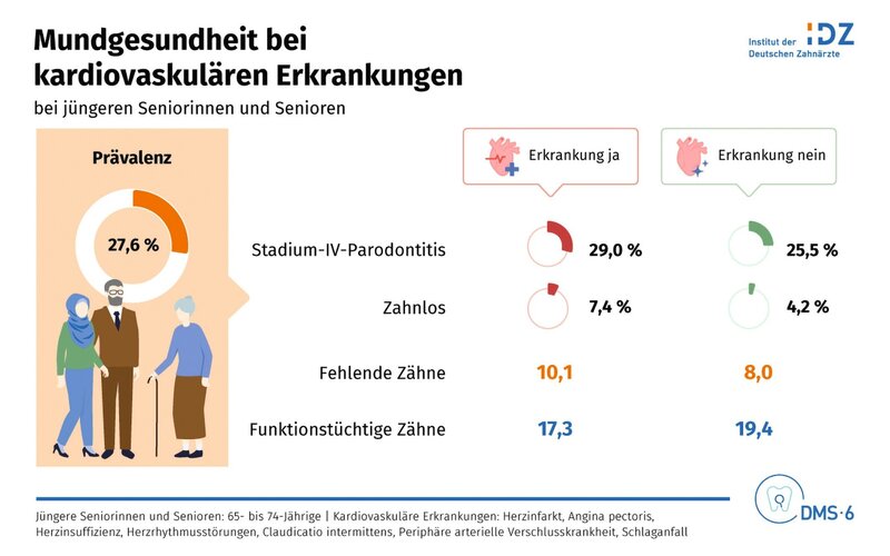 Jüngere Seniorinnen und Senioren mit Herz-Kreislauf-Erkrankungen hatten eine geringere durchschnittliche Anzahl an Zähnen (-2,1 Zähne) und waren häufiger zahnlos als Teilnehmende ohne Herz-Kreislauf-Erkrankungen (7,4 gegenüber 4,2 Prozent).