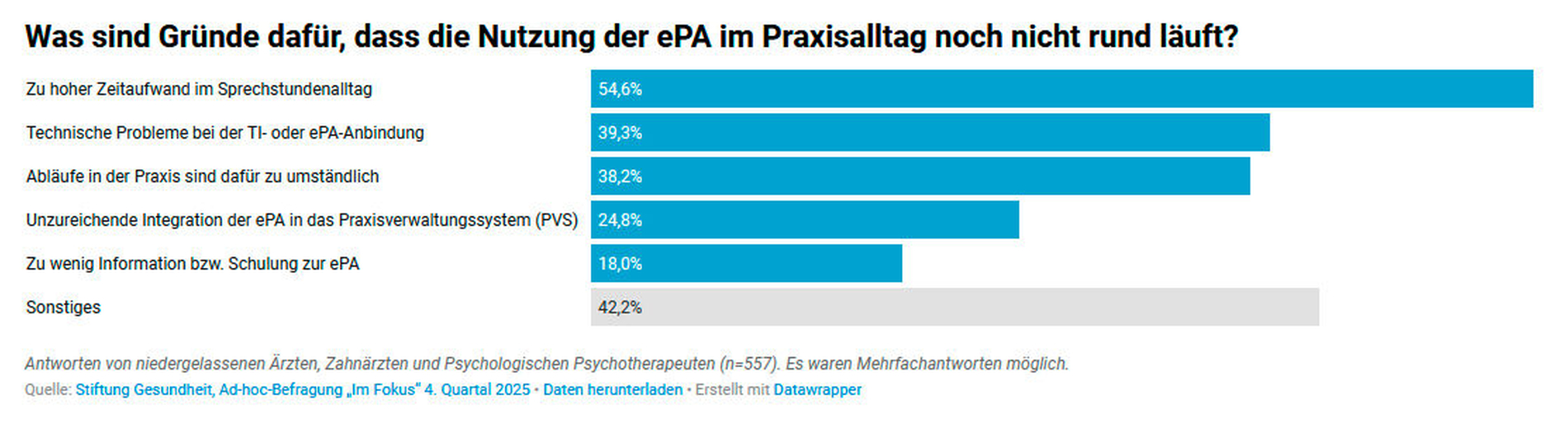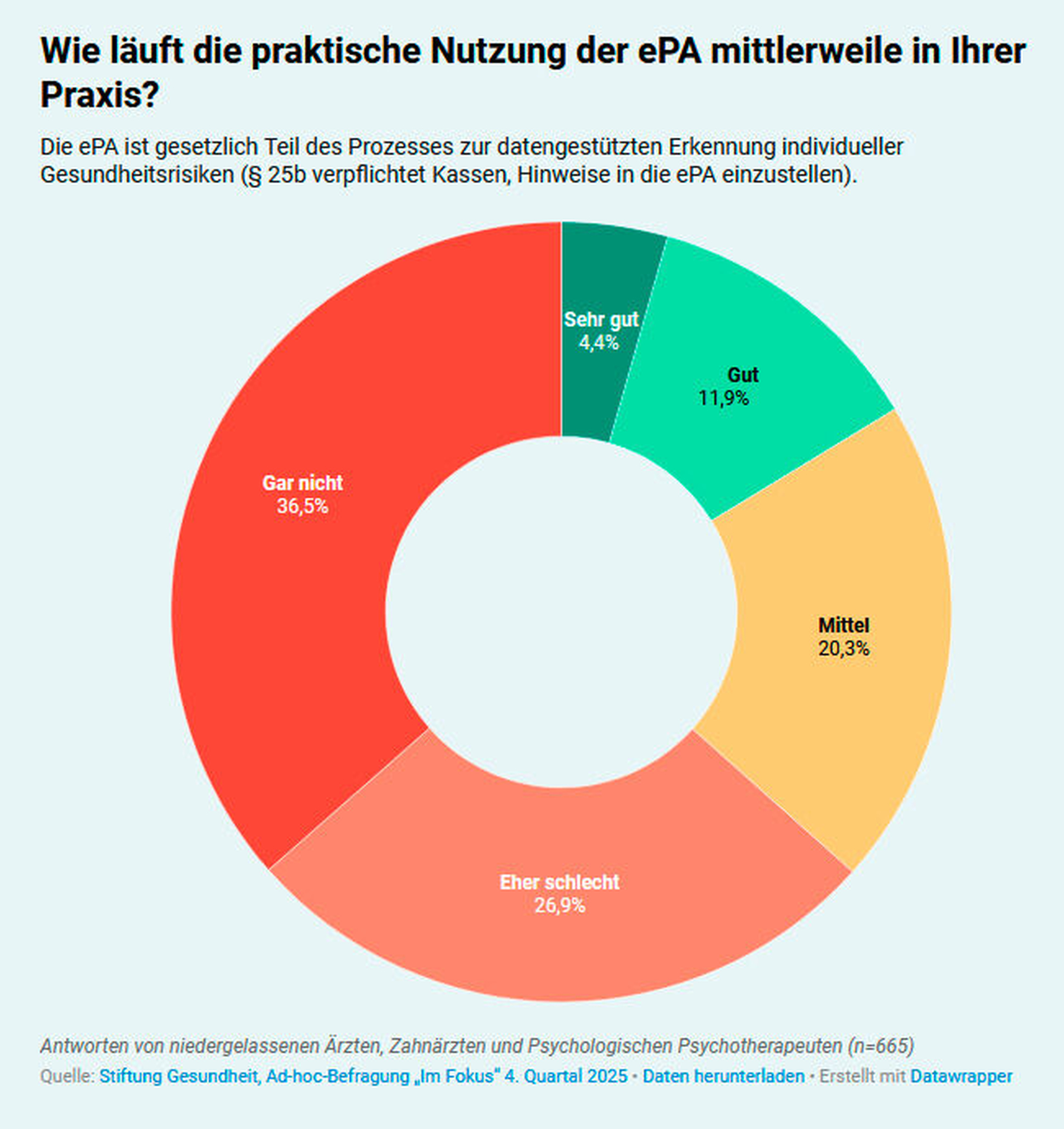 Im Rahmen ihrer Ad-hoc-Befragungsreihe „Im Fokus“ befragte die Stiftung Gesundheit im vierten Quartal 2025 insgesamt 665 niedergelassene Ärzte, Zahnärzte und Psychologische Psychotherapeuten unter anderem nach ihren Erfahrungen mit der Nutzung der elektronischen Patientenakte (ePA). „Die Ergebnisse sind ernüchternd: Fast zwei Drittel der Ärzte berichten, dass es ‚eher schlecht‘ oder ‚gar nicht‘ laufe. 20,3 Prozent bezeichnen den aktuellen Stand als ‚mittel‘. Lediglich 16,3 Prozent bewerten die praktische Nutzung als ‚gut‘ oder ‚sehr gut‘“, schreibt die Stiftung in ihrem Ergebnisreport.