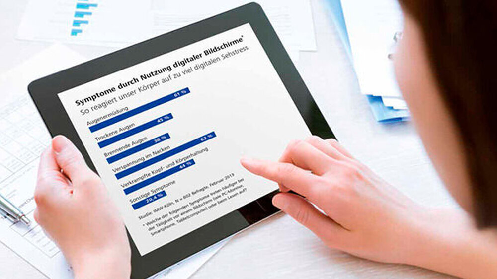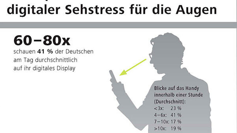 Müde oder brennende Augen, Nackenverspannungen, Kopfschmerzen - wer viel und häufig digitale mobile Endgeräte wie Smartphones, Tablets oder E-Reader nutzt, kennt diese Beschwerden. Eine Anfang April gestartete Umfrage unter 1.000 Deutschen im Alter zwischen 20 und 50 Jahren ergab, dass jeder Smartphone-Besitzer durchschnittlich 60 bis 80 Mal täglich auf sein digitales Display schaut. Echte Vielnutzer checken sogar mehr als zehn Mal in der Stunde ihren Handy- oder Tablet-Screen (17 Prozent), die Mehrheit vier bis sechs Mal (41 Prozent).