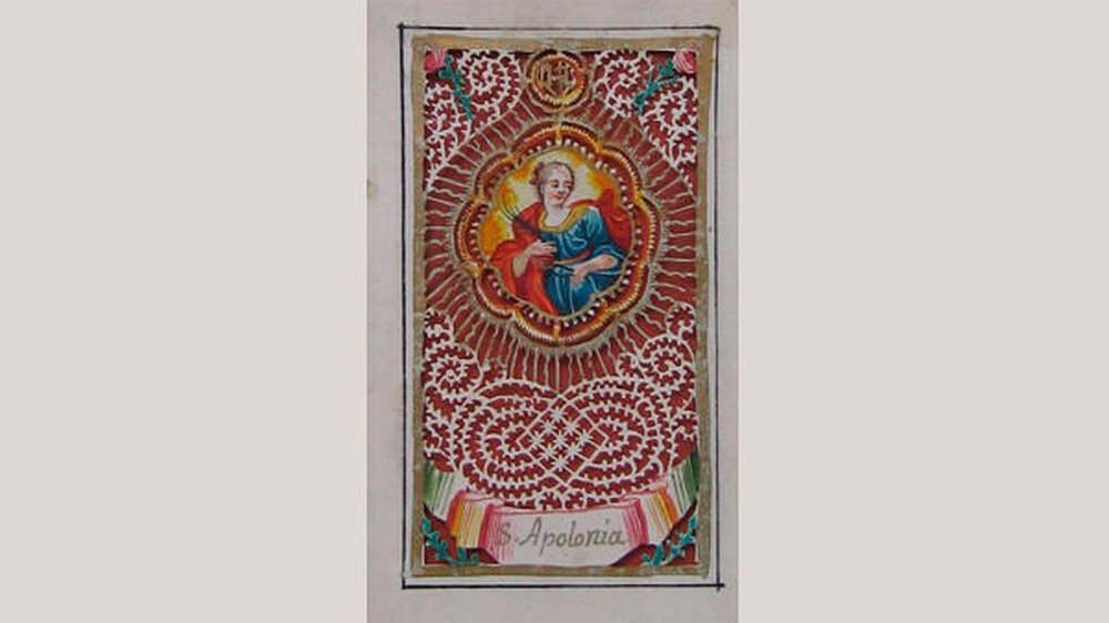 In über zweihundert kleinen Andachtsbildern, die von dem Zahnmediziner Dr. Dieter Pack in einer Sammlung zusammengetragen wurden, kann man den Wandel der Zeit und das sich wechselnde Stilempfinden in den Darstellungen ablesen. Den Gläubigen präsentiert sich die Heilige Apollonia manchmal ein wenig erdentrückt, den Blick zum Himmel gewandt, mit ihren Attributen und einem Heiligenschein. Im 17. Jahrhundert vermutet man in ihrer Haltung, der Kleidung und dem Blick eher eine höfische Dame. Irritierend wirken dann allerdings der Heiligenschein und die Folterwerkzeuge.