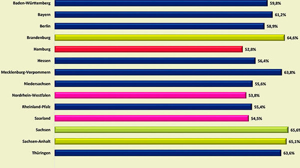 Während 2018 jeweils mehr als zwei Drittel der Sachsen und Sachsen-Anhalter mindestens einmal zur Vorsorge zum Zahnarzt gingen, waren es in Nordrhein-Westfalen und im Saarland nur um die 54 Prozent. Die größten Zahnarztmuffel leben offenbar in Hamburg: Dort ließen sich nur knapp 53 Prozent einen Termin zur jährlichen Kontrolle geben. Gegenüber 2013 bedeutet das für alle Bundesländer ein leichtes Minus beziehungsweise eine Stagnation.