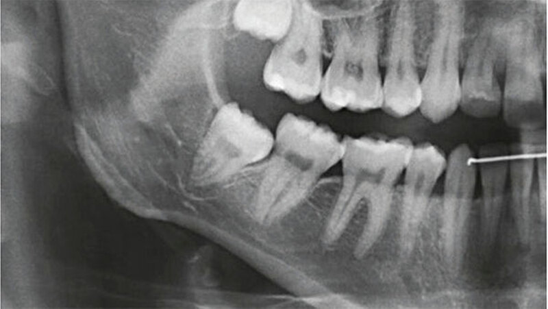 Nach einem Jahr wurde eine radiologische sowie eine klinische Nachkontrolle durchgeführt. Die Patientin war beschwerdefrei. Radiologisch war eine deutliche Migration des Wurzelblocks in kranialer Richtung sichtbar, die Wurzelspitze war radiologisch nicht über den Mandibularkanal projiziert. Die Schleimhaut war nicht durchbrochen (Abb. 1l und 1m). In diesem Fall sollte eine vollständige Entfernung des Wurzelrests angestrebt werden.