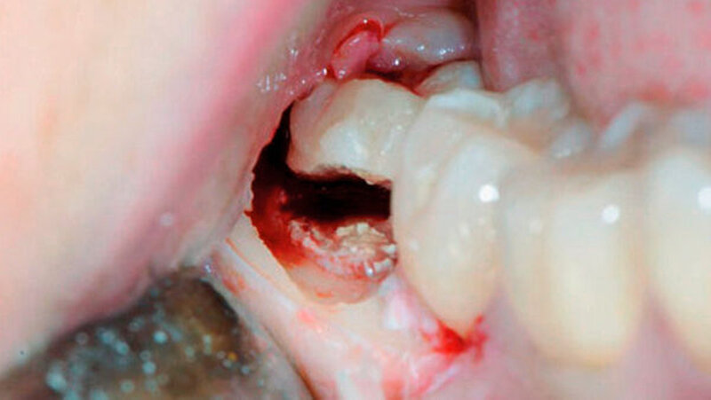 Frühe postoperative Infektion. Die Symptome sind ähnlich wie bei einer Alveolitis sicca und können rezidivierend auftreten. Häufig kann eine falsche chirurgische Technik verantwortlich gemacht werden bei unvollständiger Entfernung von Zahnschmelz (Patel et al. 2014). Eine vollständige Wurzelextraktion ist dann indiziert (Tab. II).