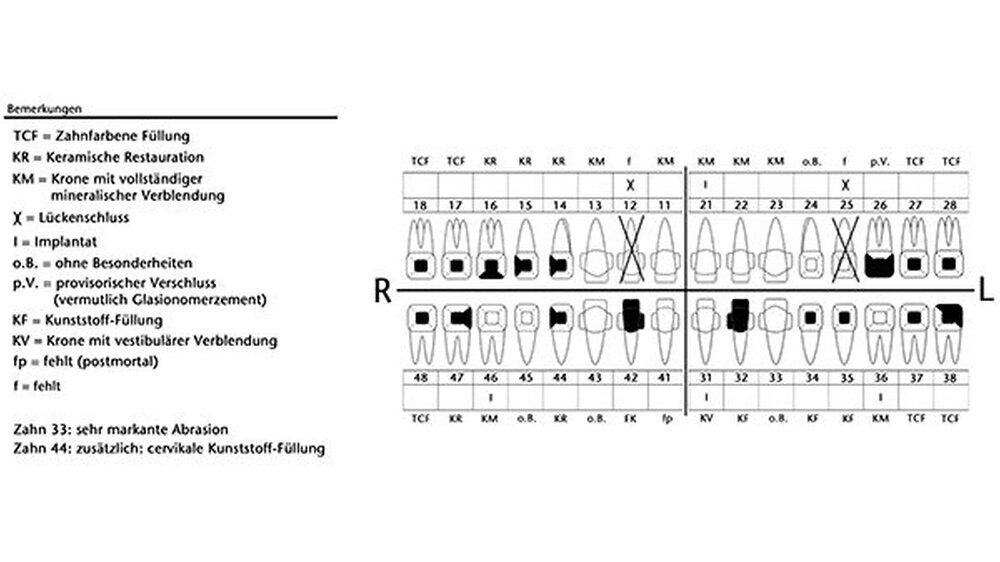 Zahnstatus:Aus dem Zahnstatus ersichtlich ist, dass es sich um hochwertige zahntechnische Arbeiten handelt, die auf eine mögliche privatkassenärztliche Versorgung schließen lassen. Der forensisch-odontologische Gutachter vermutet, dass alle Arbeiten durch denselben Zahnarzt gemacht wurden.