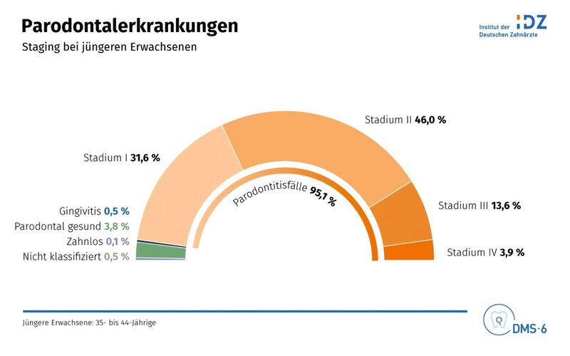 Knapp vier Prozent der jüngeren Erwachsenen in Deutschland im Alter von 35 bis 44 Jahren sind nach der neuen Klassifikation parodontal gesund und weitere 0,5 Prozent weisen lediglich eine Zahnfleischentzündung (Gingivitis) auf. Abgesehen von wenigen jüngeren Erwachsenen, die zahnlos oder nicht klassifizierbar sind, weisen 95 Prozent der jüngeren Erwachsenen eine Parodontitis auf. Schwere Parodontitis (Stadium III und IV) kommt bei 18 Prozent der 35- bis 44-Jährigen vor, davon fallen 14 Prozent auf das Stadium III mit dem Potenzial des weiteren Zahnverlusts und bei knapp 4 Prozent besteht gar die Gefahr des Verlusts der ganzen Dentition (Stadium IV). Eine moderate Parodontitis (Stadium II) weist knapp die Hälfte der jüngeren Erwachsenen auf und fast ein Drittel eine initiale Stadium-I-Parodontitis. Die Ergebnisse überraschen, denn Parodontitis ist eine altersassoziierte Erkrankung und das junge Erwachsenenalter ist ein Lebensabschnitt, in dem chronische Verlaufsformen erst beginnen (sollten). Dennoch sind 95 Prozent der Menschen in Deutschland zu diesem Zeitpunkt bereits erkrankt.