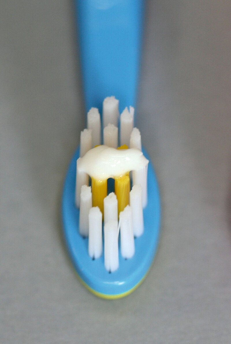 Dieser rechnerische Sicherheitsabstand wurde in erster Linie zur Wahrung der Alltagssicherheit in die Publikation der Empfehlungen aufgenommen. In keiner Weise soll der Eindruck entstehen, das Ziel, die geringen empfohlenen Mengen aus der Tube zu entnehmen, wäre damit hinfällig. Die Aufgabe für das zahnärztliche Team, die korrekte Entnahme zum Beispiel im Zuge der Leistungsposition FU-Pr zu kommunizieren und hierzu anzuleiten, bleibt unverändert bestehen. Eine einfache Möglichkeit, die geringe Entnahme einer reiskorngroßen Zahnpastamenge zu erleichtern, kann darin bestehen, das Borstenfeld der Zahnbürste quer mit Zahnpasta zu beschicken (Abbildung 1).