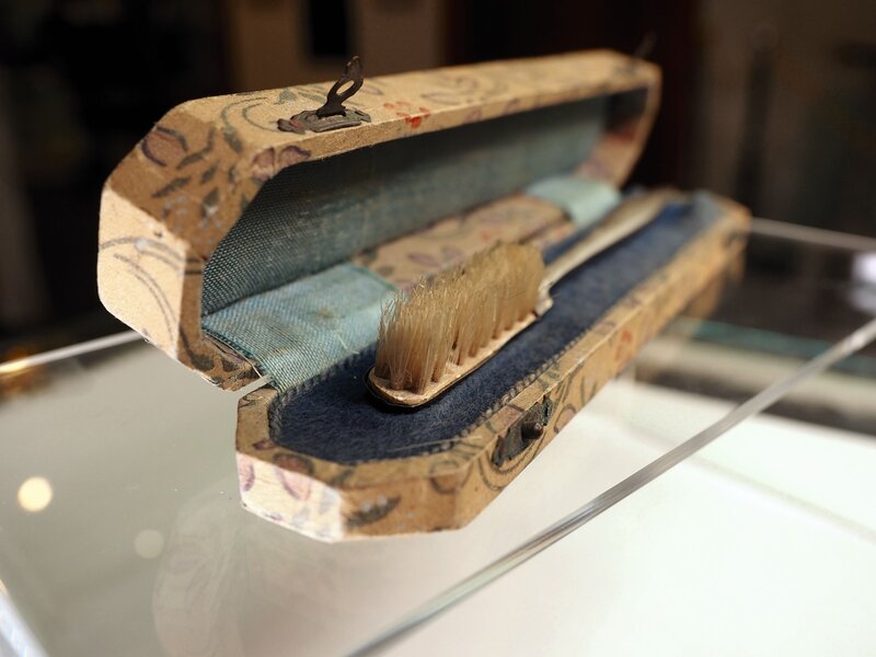Besonders wertvoll bei unserer Zahnbürste ist dagegen das originale, handbemalte Etui. Die Bürste kommt aus Lissabon, Portugal. Aufgrund der überaus hochwertigen und seltenen Fertigung muss man auch hier von einem adeligen oder sogar hochadeligen Haushalt ausgehen. So hatte beispielsweise die Großherzogin Stephanie von Baden ebenfalls eine solche Zahnbürste, da sie verwandt mit Napoleon war.