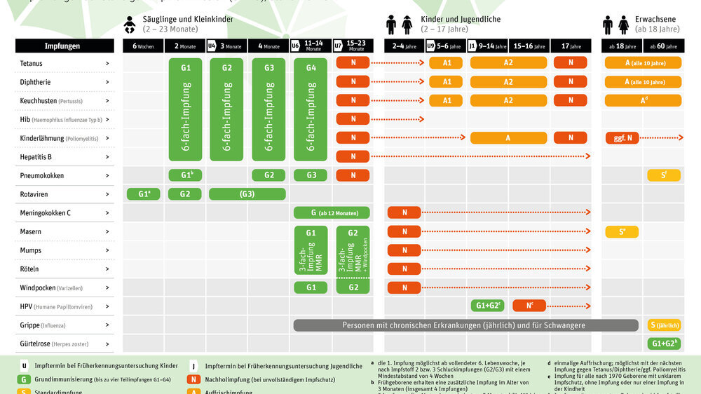 Die BZgA hat den auf Angaben des Robert Koch-Instituts (RKI) beruhenden Impfkalender grafisch aufbereitet (eine größere Darstellung finden Sie hier ). Der Kalender gibt einen Überblick der empfohlenen Impfungen. Außerdem hat die BZgA ihre Informationsseite zum Impfen aktualisiert.