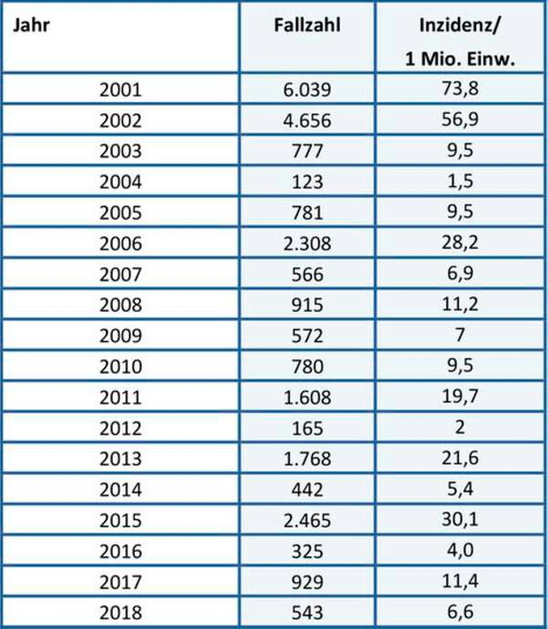 Das RKI hat die gemeldeten Masernfälle zwischen 2001 und 2018 und deren Inzidenz pro eine Million Einwohner in einer Tabelle zusammengefasst.
