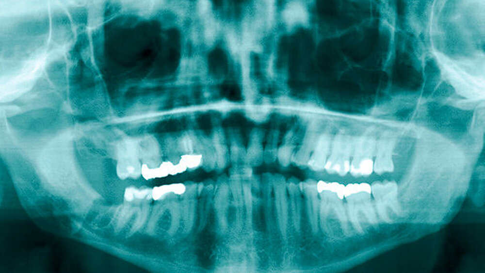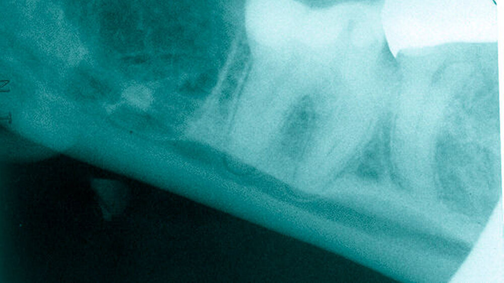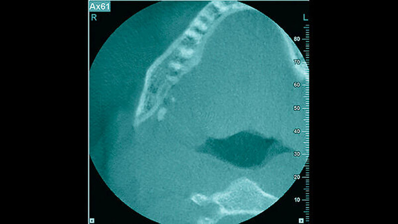 Ein 19-jähriger Patient stellte sich mit der Bitte um Weiterbehandlung bei einem in die rechte Submandibularloge luxierten Wurzelrest 48 vor. Bei einer alio loco in Lokalanästhesie begonnenen operativen Entfernung des Zahnes 48, die circa eine Stunde zurücklag, sei ein Wurzelrest in den rechten Mundboden luxiert worden. Klinisch zeigten sich extraoral eine Schwellung im Bereich der rechten Wange, intra-oral eine mit resorbierbarem Nahtmaterial versorgte Winkelschnittführung regio 48 und eine diskrete Schwellung im Bereich des posterioren Mundbodens rechts. Sensibilitätsstörungen im Bereich des Nervus alveolaris inferior und des Nervus lingualis konnten aufgrund der zeitlichen Nähe zur alio loco durchgeführten Lokalanästhesie nur eingeschränkt beurteilt werden. Die maximale Mundöffnung betrug circa 50 mm.