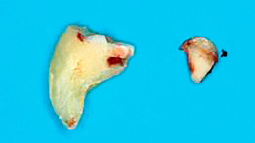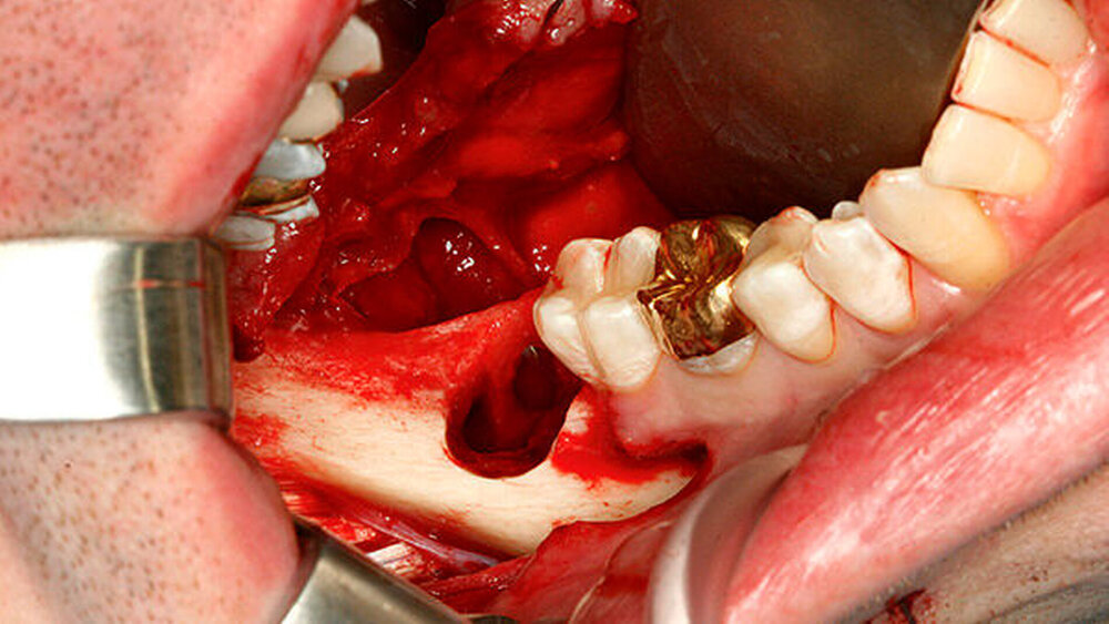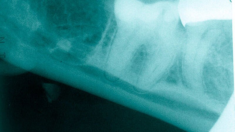 Da von transoral keine direkte Sicht ins Spatium submandibulare möglich war, wurde das Wurzelfragment 48 mit dem Zeigefinger palpiert und mit einer stumpfen gebogenen Klemme und der Fingerbeere entfernt (Abbildung 7). Das kleinere Kortikalisfragment ließ sich digital identifizieren und in gleicher Weise entfernen. Nach Reposition der Weichteile erfolgte ein mehrschichtiger Wundverschluss mit Einzelknopfnähten, zirkumdentalen Nähten und einer Tabaksbeutelnaht regio 37 zur Refixierung des lingualen Mukoperiostlappens. Der postoperative Verlauf gestaltete sich unter perioperativer Antibiose komplikationslos. Die postoperativen radiologischen Kontrollaufnahmen (Orthopantomogramm, Zahnfilm) ergaben keinen Hinweis auf ein verbliebenes Zahnfragment.