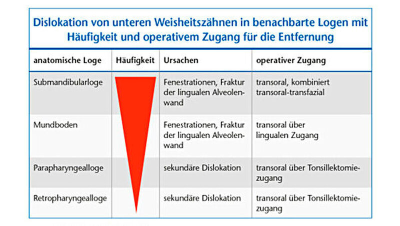 In den Mundboden und in die pterygo-mandibulare Loge luxierte Weisheitszähne können in der Regel über einen trans-oralen Zugang entfernt werden [Laskin DM, 1985; Peterson LJ et al., 1998]. Sinnvoll ist – wie beschrieben – eine H-förmige Inzision im retromolaren Bereich. Bei diesem Zugang ist die Gefahr einer Verletzung des Nervus lingualis zu beachten, die durch verschiedene Techniken minimiert werden kann. In einer Arbeit [Huang I-Y et al., 2002] wird dafür eine Technik empfohlen, bei der durch eine U-förmige Osteotomie der lingualen Alveolenwand mit dem Meißel und dem anschließenden vorsichtigen Herausbrechen und Mobilisieren der Alveolenwand nach lingual der Nervus lingualis schonend abgehalten werden kann. Bei Zähnen, die in die parapharyngeale Loge luxiert wurden, erfolgt eine transorale Entfernung über einen Tonsillektomiezugang [Laskin DM, 1985]. Vorteil der trans-oralen Zugänge ist die später nicht sichtbare Narbe. Ein Problem der trans-oralen Zugänge ist eine mögliche sekundäre Dislokation des Zahnfragments bei der operativen Entfernung, die aufgrund der schlechten Übersicht des Zugangs entstehen und dann ein kombiniert trans-oral-transfaziales Vorgehen bedingen kann. In neueren Arbeiten wird auch die Lokalisa-tion von dislozierten Weisheitszähnen unter Zuhilfenahme von intraoperativer Navigation beschrieben [Campell A et al., 2010]. Dieses Verfahren stellt aber eher eine Ausnahme für komplizierte Fälle dar, denn die meisten akzidentiellen Dislokationen von unteren Weisheitszähnen erfolgen in die Submandibularloge oder in den posterioren Anteil des Mundbodens und können über einen trans-oralen Zugang ohne intraoperative Bildgebung entfernt werden (siehe Tabelle).