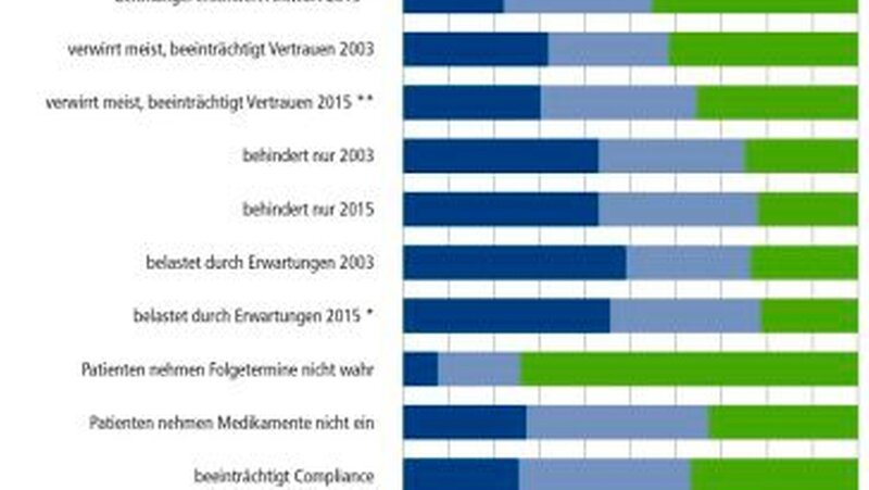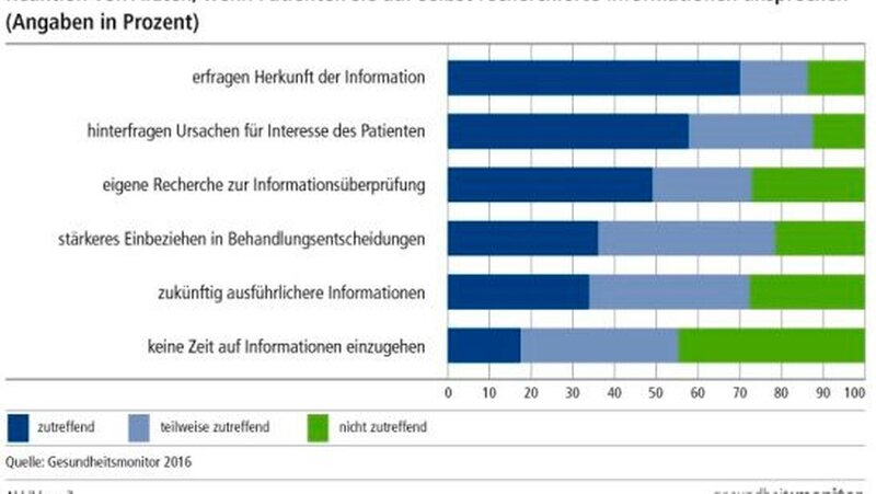 Knapp die Hälfte der befragten Ärzte (47 Prozent) sehen in selbstinformierten Patienten eine Chance für eine positive Veränderung. 45 Prozent der Befragten sind der Meinung, die Selbstinformation erzeuge vielfach unangemessene Erwartungen und Ansprüche beim Patienten, die ihre Arbeit nur belaste. 30 Prozent der Ärzte bestätigen, dass die Selbstinformation die Patienten verwirre und das Vertrauen zum Arzt beenträchtige. Fast ein Viertel der Ärzte gab zudem an, dass die Selbstinformation die Compliance der Patienten beeinträchtige (25 Prozent). Etwa ebenso viele (27 Prozent) stimmten der Aussage zu, dass Patienten dadurch verschriebene Medikamente nicht einnähmen.