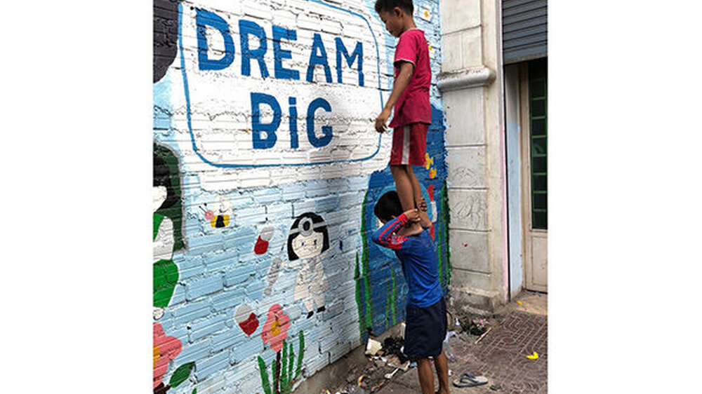 Der Londoner Kieferorthopäde Anton Bass fotografierte die zwei Jungen im März dieses Jahres, der eine auf den Schultern des anderen stehend, vor einer Grafitti-Wand mit dem Slogan: DREAM BIG.