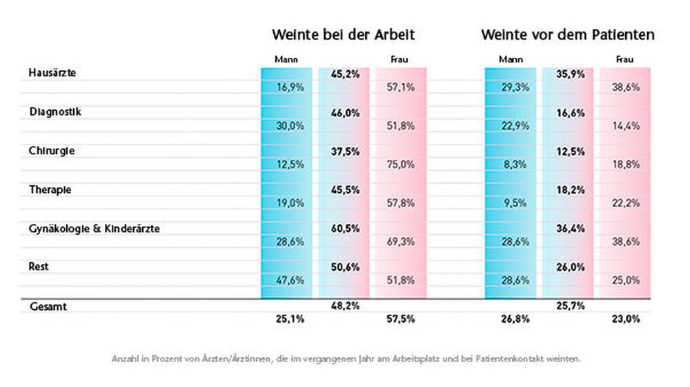 Die Ergebnisse der Umfrage zeigen, dass mehr als die Hälfte der Ärztinnen und ein Viertel der Ärzte im vergangenen Jahr mindestens einmal auf der Arbeit geweint haben. Ein Viertel während eines Patientenkontakts.