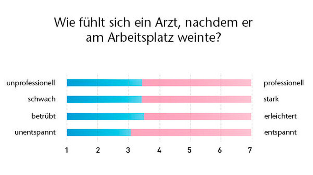 Die Hälfte der Ärzte gab an, es sei okay, bei der Arbeit zu weinen. Doch nicht jeder Grund wird gleichermaßen akzeptiert. Weinen wegen persönlicher Umstände oder wegen der schlechten Gesundheitssituation eines Patienten halten mehr als die Hälfte der Ärzte für akzeptabel. Sie reagieren in der Regel verständnisvoll, wenn sie erfahren, dass Kollegen deswegen in Tränen ausbrechen.