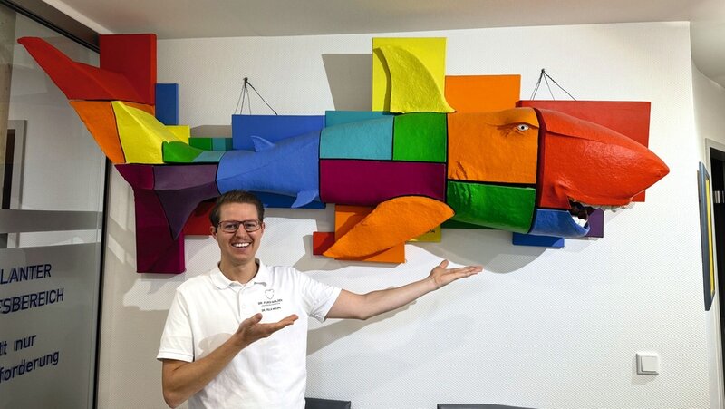 Vor allen Dingen mit Kindern. Sie sind besonders von der großen Hai-Skulptur fasziniert. Über ihn kann man mit den Kleinen vor dem Gang ins Behandlungszimmer spielerisch ins Gespräch kommen. Ich sage dann immer so was wie: „Schau mal, der Hai hat auch Zähne – und er hat sogar einen Goldzahn.“ Das Suchspiel nach dem Goldzahn hilft gerade bei ängstlichen Kindern sehr, das Eis zu brechen. Interessant finde ich, dass der Goldzahn bisher noch keinem Erwachsenen aufgefallen ist. Von ihnen werden wir hingegen oft auf die Dimensionen des Objekts angesprochen.