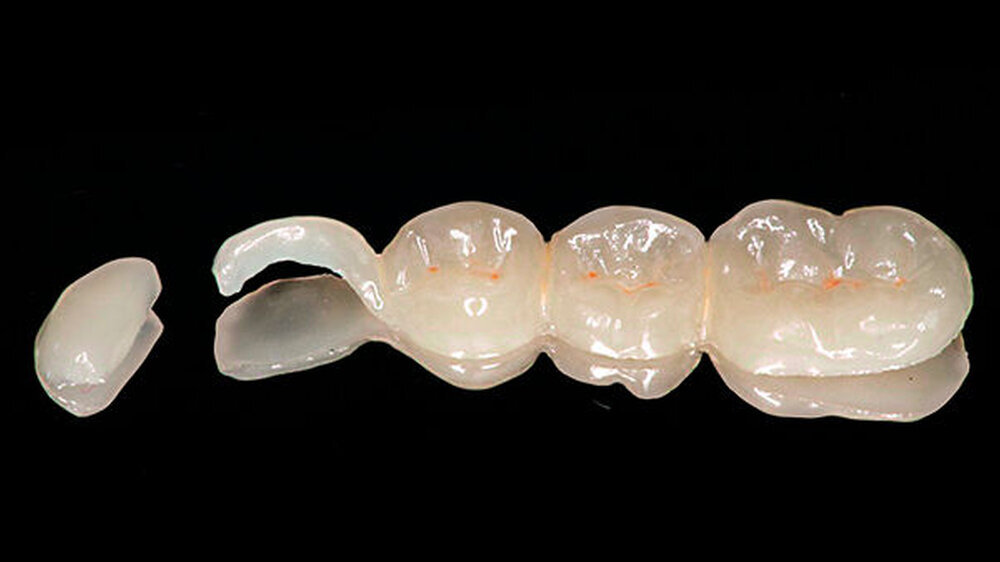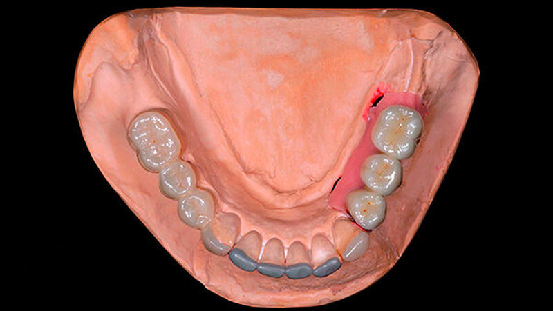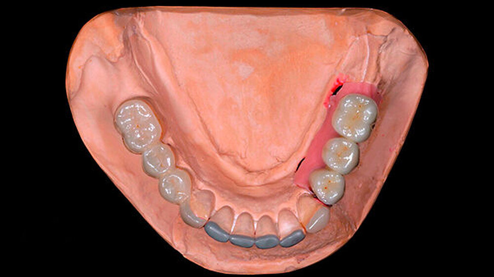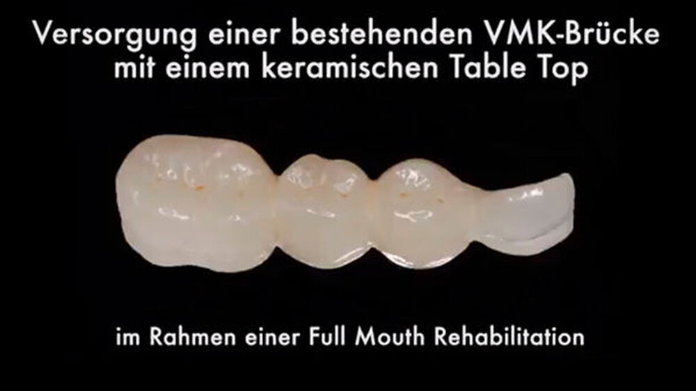 Erstmalig wurde die Verblendung einer mehrgliedrigen VMK-Brücke im Molarenbereich zwecks Ebenenkorrektur mit einem vollkeramischen Table Top restauriert (Abbildung 1), begründet die Jury ihre Entscheidung.