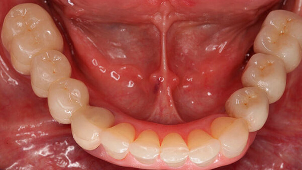 Anschließend erfolgte die adhäsive Befestigung des Table Tops 33 und der direkte Kompositaufbau der Unterkieferfront mittels Silikonschlüssel vom Wax-up (Abbildungen 4 und 5). Drei Monate nach Eingliederung zeigte sich klinisch ein ästhetisch und funktionell einwandfreies Ergebnis (Abbildung 6).