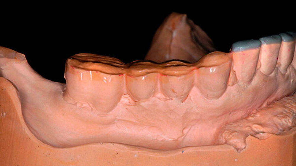 Nach Planung eines geringen okklusalen Abtrags in der Verblendkeramik wurde mittels eines Silikonschlüssels der Ist-Zustand ermittelt und die Präparation bis kurz vor die Opakerschicht vorgenommen (Abbildung 2). Für den abgetragenen Bereich wurde ein mehrgliedriges Provisorium aus Kunststoff zahnfarbig angefertigt und, nach Abstrahlung mit Korub, adhäsiv befestigt. Nach Kieferrelationsbestimmung wurde die endgültige vollkeramische Restauration zur Rehabilitation der Okklusalflächen mit einem Wax-up definiert.