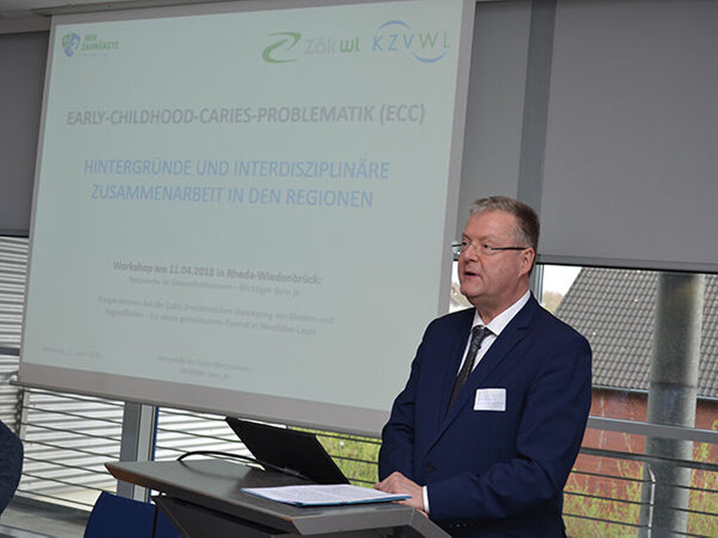 Nachdem der Vorsitzender der KZVWL-Vertreterversammlung Dr. Frank Bordan die Teilnehmer begrüßt hatte, berichtete Dr. Wilfried Beckmann (Mitglied des Vorstandes der ZÄKWL) über Early-Childhood-Caries-Problematik (ECC) und die interdisziplinäre Zusammenarbeit mit anderen Arztgruppen in den Regionen. Thomas Hamacher, Leiter der KZVWL-Vertragsabteilung, stellte außerdem die Besonderheiten des zahnärztlichen Kinderuntersuchungsheftes in Westfalen-Lippe vor. Die interdisziplinäre Zusammenarbeit aus Sicht der Kinder- und Jugendärzte beleuchtete anschließend Dr. Burkhard Lawrenz, Kinder- und Jugendarzt und Landesverbandsvorsitzender von Westfalen-Lippe des BVKJ e.V.