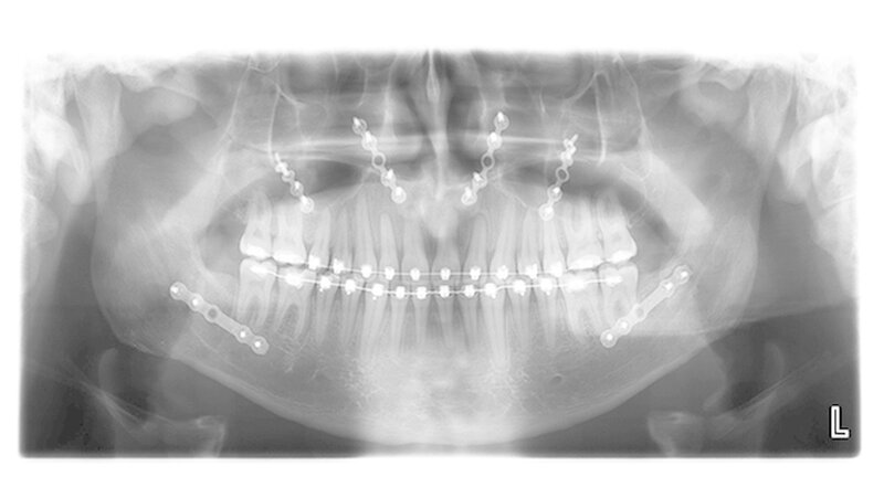 Die Platten und Schrauben fixieren den Knochen in der Art und Weise, dass der Patient postoperativ weiche Kost essen darf. Nach einer Woche werden die Fäden entfernt, die kieferorthopädische Feineinstellungdes Bisses kann jetzt beginnen.