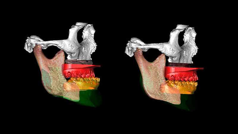 Die Abbildungen 1 und 2 zeigen die klinische Situation bei Erstvorstellung: Der Unterkiefer ist zu prominent. Der Oberkiefer und das Mittelgesicht liegen zurück. In der Front liegt ein umgekehrter Überbiss vor. Der Unterkiefer steht vor dem Oberkiefer. Das erschwert das Abbeißen und Kauen der Nahrung. Die Scans (siehe Abbildungen) dokumentieren, wie aufwendig die virtuelle Operationsplanung erfolgen musste.