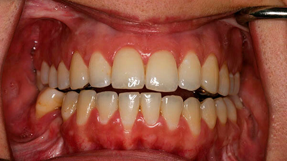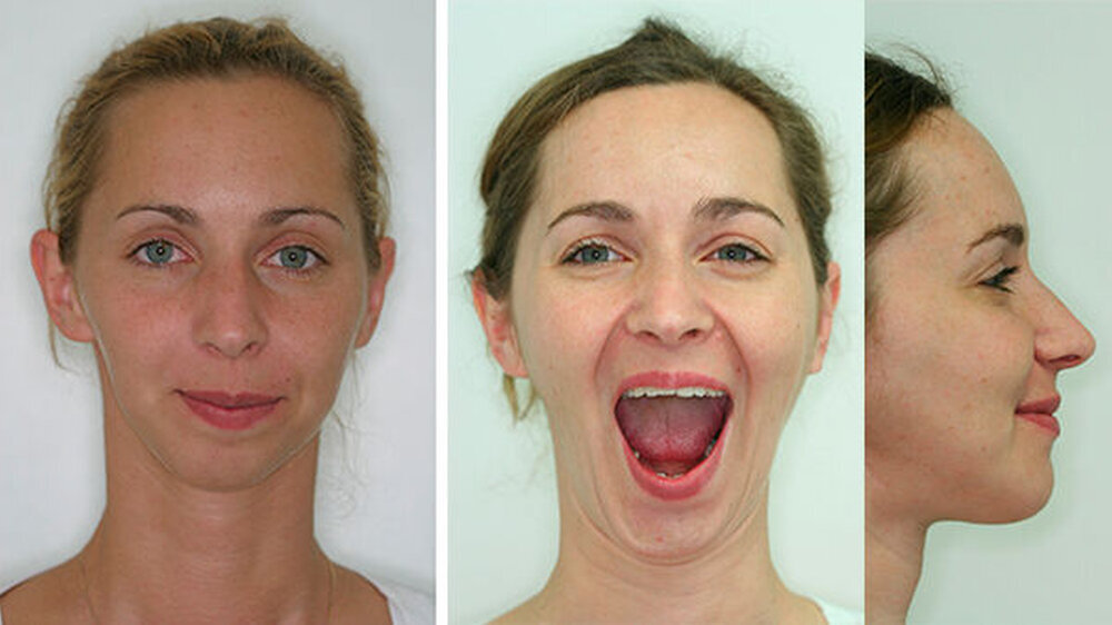 Die Patientin war gerade über 20 Jahre alt, als die Krankheit schleichend begann: Zunächst fiel der jungen Frau auf, dass der Kontakt zwischen den oberen und den unteren Schneidezähnen immer mehr verloren ging. Mit der Zeit wurde die Lücke immer größer, was im weiteren Verlauf ein Abbeißen unmöglich machte. Zudem bemerkte sie, dass ihr Kinn immer fliehender wurde, also immer weiter zurückfiel.