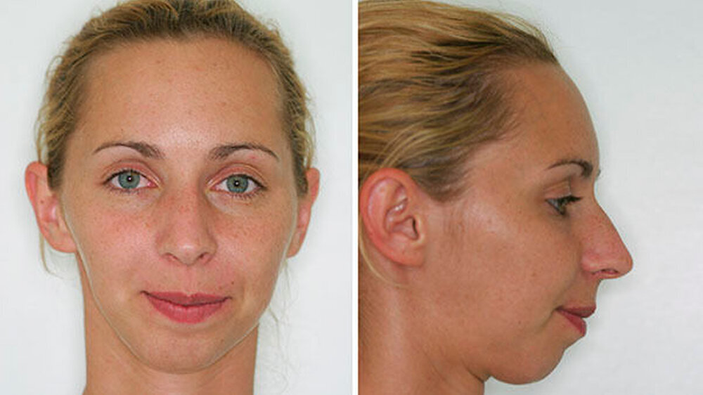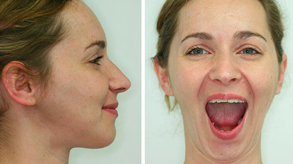 Der fortschreitende Schwund der Kiefergelenkfortsätze führte bei einer 28-jährigen Patientin zur Öffnung des Zusammenbisses von Ober- und Unterkieferzähnen und zur Rückwanderung des Unterkiefers. Sie hatte erhebliche Schwierigkeiten beim Essen und ihr Profil war dramatisch verändert (Vogelgesicht).
