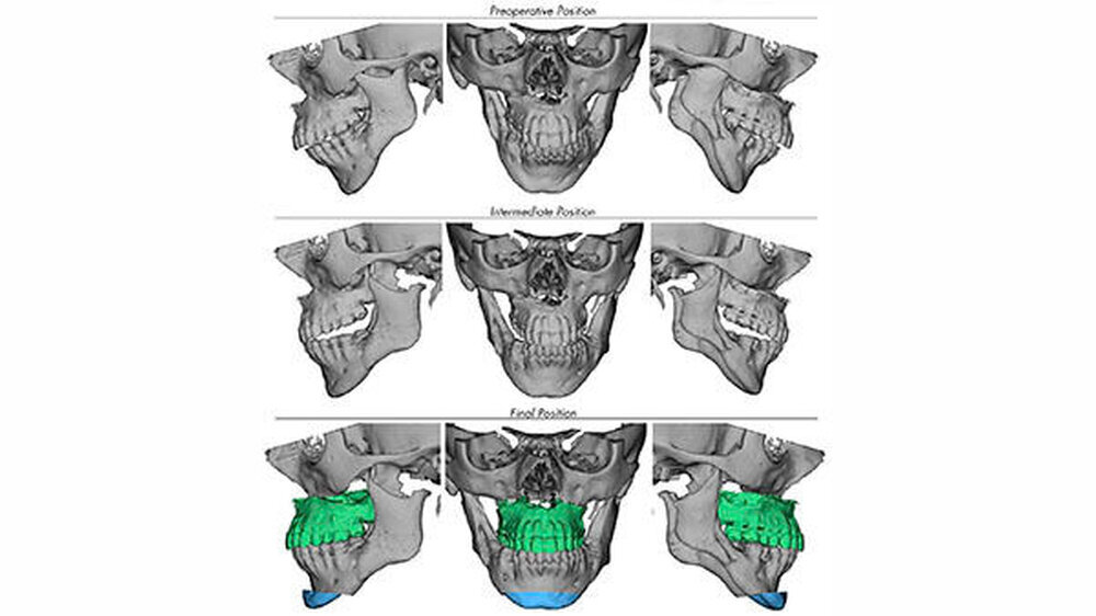 Durch diese hoch anspruchsvollen Verfahren ließ sich annähernd die ursprüngliche Position des Unterkiefers vor der Einschmelzung wiederherstellen; in der gleichen Operation wurde die Position des Oberkiefers der jetzt idealen Stellung des Unterkiefers angepasst.