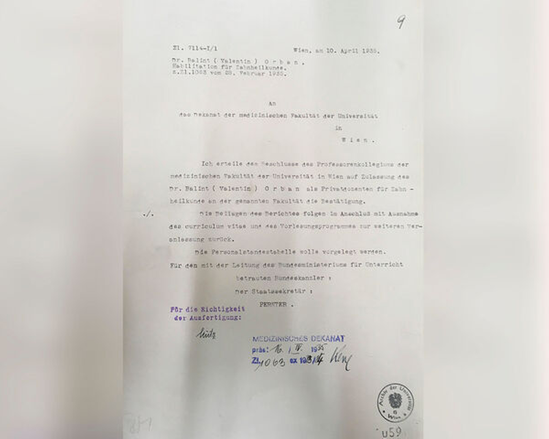 So führte Orbán parallel zur universitären Tätigkeit eine Privatpraxis in Wien. Trotz der erschwerten Bedingungen gelang es ihm, sich im Februar 1935 für das Fach Zahnheilkunde zu habilitieren (Abb. 2). 1937 entschloss er sich jedoch zur Auswanderung in die USA und traf diesbezüglich „mit Arthur Black, dem Dekan der Northwestern Universität ein Arrangement zur sicheren Ausreise für sich und seine Familie“ [Djafari, 2003].