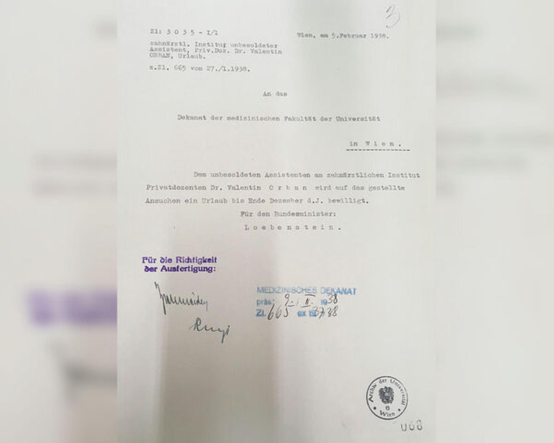 Orbán kam damit dem Schicksal vieler jüdischer Kollegen zuvor, die nach dem „Anschluss“ Österreichs an Hitler-Deutschland (1938) – und im Deutschen Reich bereits seit der Machtübernahme durch die Nationalsozialisten (1933) – zwangsweise emigrierten, ohne eine konkrete berufliche Perspektive zu haben [Groß, 2018; Groß et al., 2018; Groß, 2019; Groß/Krischel, 2020]. Orbán dagegen konnte seine Ausreise noch sorgfältig planen: Er stellte Ende 1937 an der Universität Wien einen Antrag auf Beurlaubung (Abb. 3). Derweil besorgte Dekan Arthur Black (1870–1937) dem Ehepaar Orbán und seinem erstgeborenen Sohn ein Einreisevisum und er vermittelte Orbán darüber hinaus eine Anstellung sowie einen Studienplatz an der Northwestern University in Chicago/Illinois. Arthur Black war der Sohn von Greene Vardiman Black (1836–1915), dem berühmten Namensgeber der „Black‘schen Regeln“ für die Kavitätenpräparation.