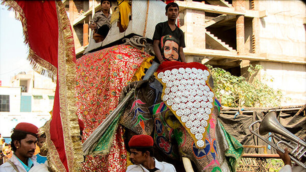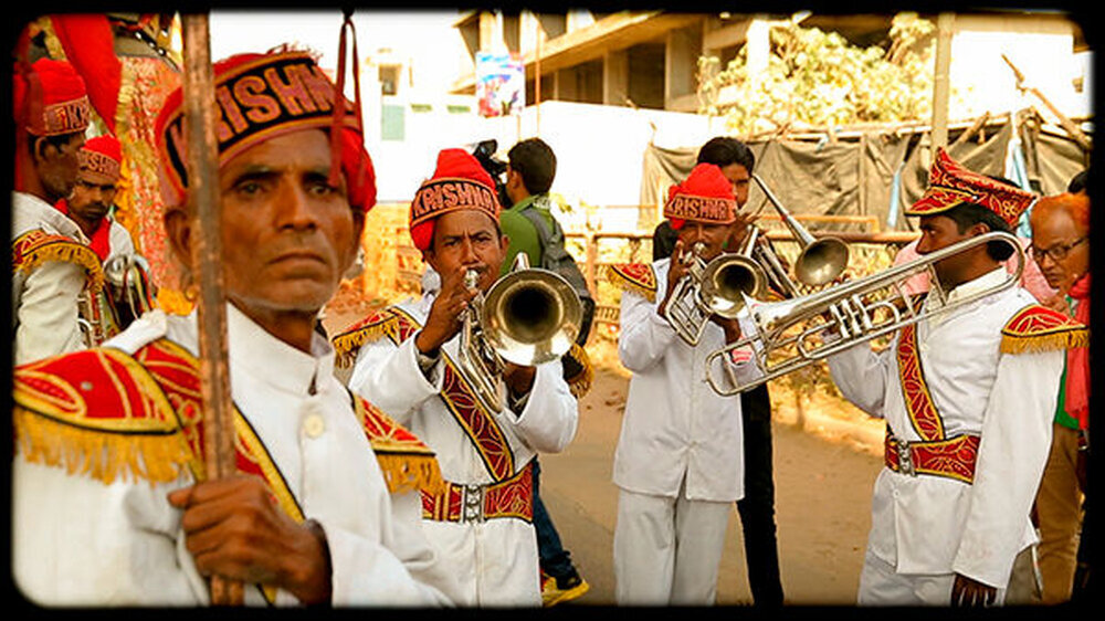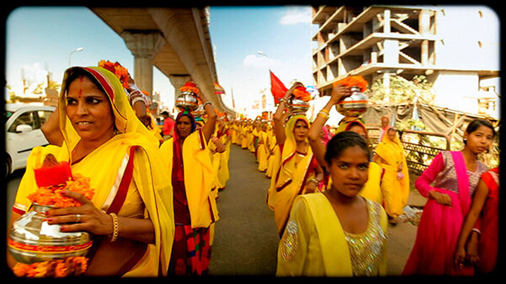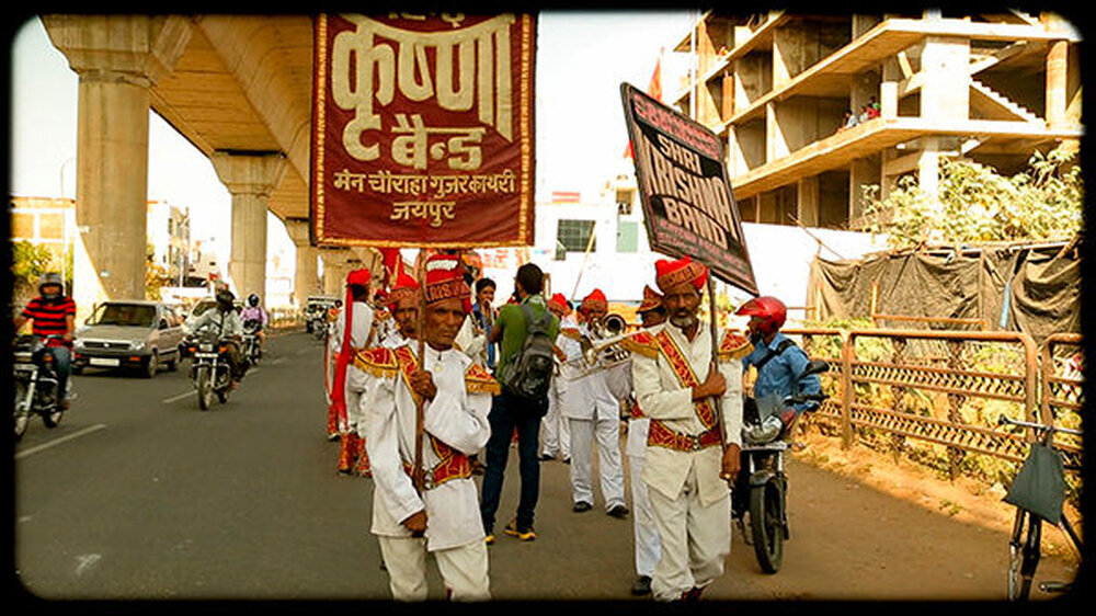 Es geht nur sehr langsam voran - trotzdem kommen meine Gedanken nicht hinterher. Da sehen wir auf der anderen Straßenseite eine lange Menschenschlange: bunt, laut, musizierend. Silberne Pferdekutschen, Kamele und Elefanten sind dabei, hunderte geschmückte Frauen und trommelnde, trompetende Männer, die Rhythmen produzieren, denen selbst ich folgen kann, die mich mitnehmen wollen.