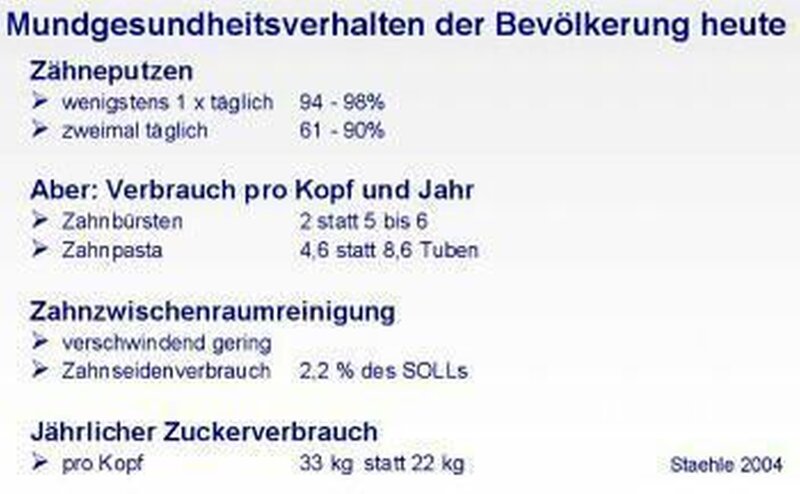 Der Verlauf der DMFT-Indizes bei Zwölfjährigen zeigt zwischen 1994 und 2000 ebenfalls einen deutlichen Rückgang der Karies. Die Werte sanken im Mittel von 2,44 (1994) auf 0,98 (2004). Insgesamt zeigte sich ein Kariesrückgang von etwa 60 Prozent innerhalb der letzten zehn Jahre. Damit ist die zweite Richtlinie der WHO eindeutig unterschritten. Wir haben uns in der weltweiten Skala der Kariesverbreitung vom obersten Bereich in das untere Drittel verbessert. Dementsprechend hat sich auch das Mundgesundheitsverhalten in der Bevölkerung gegenüber den anfangs vorgestellten Befunden von 1980 nachweislich verbessert. So putzen sich nach eigenen Angaben heute 94 bis 98 Prozent aller Befragten wenigstens einmal täglich die Zähne, 61 bis 90 Prozent sogar zweimal täglich. Allerdings werden im Mittel jährlich lediglich zwei Zahnbürsten verbraucht. Und der mittlere jährliche Verbrauch von Zahnpasta beträgt 336 Milliliter (ml), das sind nur etwa 54 Prozent der Mindestmenge von 628 ml, die gängigen Empfehlungen zufolge als notwendig erachtet wird. Der Verbrauch von Hilfsmitteln für die Reinigung des Interdentalraumes, wie etwa Zahnseide oder Zahnzwischenraumbürsten und so weiter, ist noch immer verschwindend gering. Der Zahnseidenverbrauch beispielsweise beträgt nur 2,2 Prozent der als angemessen erachteten Menge. Dagegen liegt der jährliche Pro-Kopf-Zuckerkonsum mit zirka 33 Kilogramm (kg) um 50 Prozent über der von der WHO empfohlenen Maximalmenge von 22 kg [Staehle, 2004].