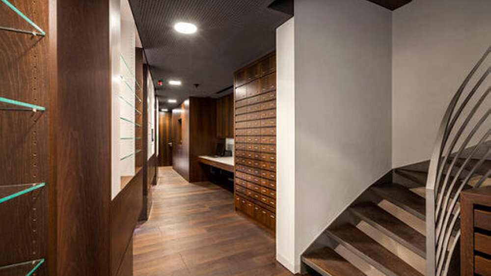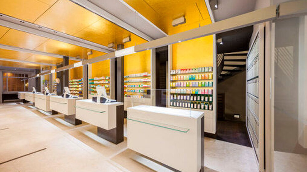 Unterstützt wird die räumliche Tiefenwirkung der Apotheke durch die Staffelung der Möbeleinbauten sowie durch eine gezielte Lichtführung. Die Regale schweben über dem Boden und gehen über in Deckensegel, die die gegenüberliegenden Freiwahlregale mit einfassen. Die Sichtwahlregale bilden die räumliche Trennung zum dahinter liegenden Backoffice, das durch seine komplette Holzverkleidung aus Räuchereiche in den Hintergrund tritt und das Gold stärker leuchten lässt.