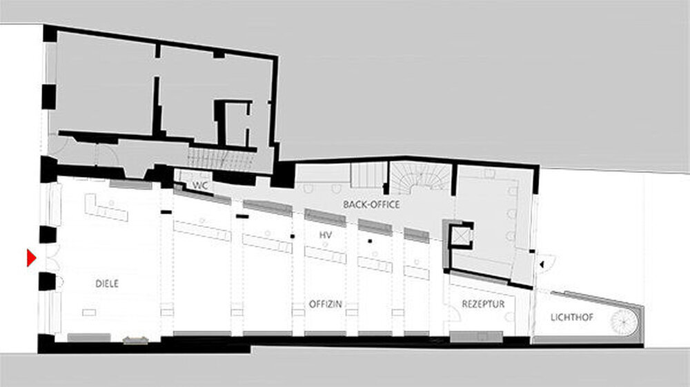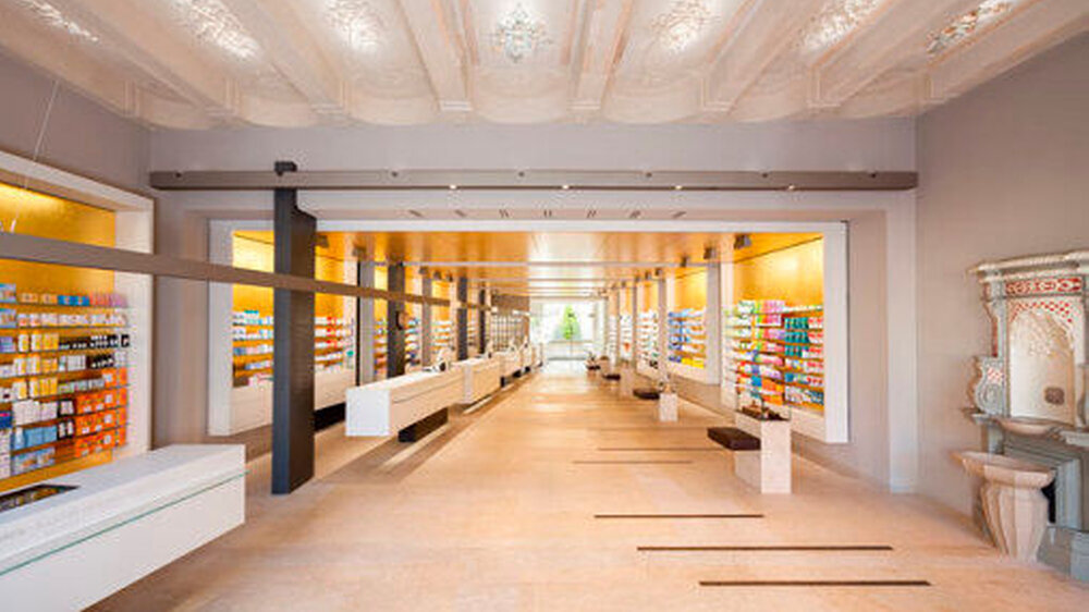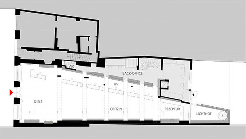 Für die Architekten galt es ein Konzept zu finden, das wieder die nächsten 50 Jahre besteht. Das einen modernen Innenraum schafft, der die heutigen funktionalen Ansprüche an eine Verkaufsstätte erfüllt und gleichzeitig in einer musealen Atmosphäre die Geschichte der ältesten Apotheke Deutschlands erzählt. Der Innenraum wurde dafür vollkommen neu gestaltet, sämtliche Innenwände entfernt und der Raum in seiner ganzen Tiefe geöffnet.